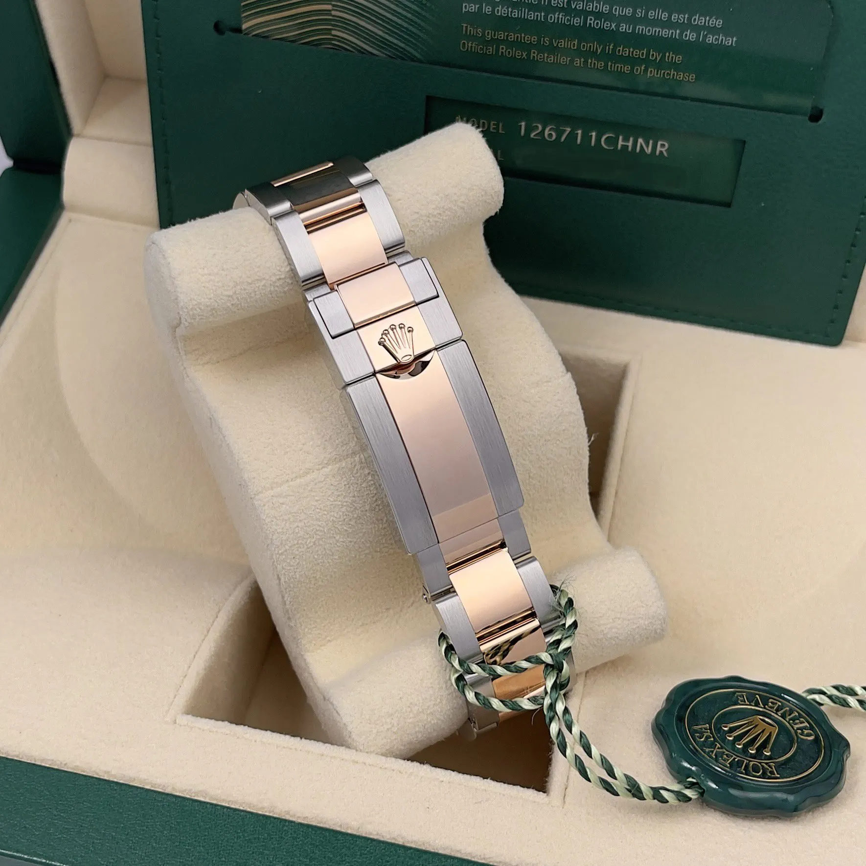 Το Rolex 126711CHNR GMT-Master II ‘Rootbeer’ Everose Gold είναι ταυτόχρονα κομψό και σπορ και δεν είναι το τυπικό σας ρολόι. Αυτό είναι σετ σε everose χρυσό και ατσάλι δύο τόνων με καφέ και μαύρο κεραμικό αμφίδρομο πλαίσιο, έτσι που ονομάστηκε «Rootbeer». Αυτό είναι τέλειο για τον παγκόσμιο ταξιδιώτη λόγω της δυνατότητας διπλής ζώνης ώρας που εκτελείται ταυτόχρονα. Είναι κομψό, αριστοκρατικό και casual ταυτόχρονα και θα κάνει μια δήλωση ανεξάρτητα από το τι κάνετε. Φορέστε το κατά τη διάρκεια της μεγάλης πτήσης σας και διατηρήστε το ενώ εξερευνάτε τον κόσμο. Μέρα ή νύχτα, αυτό λειτουργεί για όλα. Το GMT-Master II διαθέτει μια θήκη 40 χιλιοστών σε ένα δίχρωμο βραχιόλι από χρυσό και ατσάλι από στρείδια. Αυτό το ρολόι έχει απόθεμα ισχύος έως και 70 ώρες και είναι πραγματικά ένα εντυπωσιακό ρολόι.